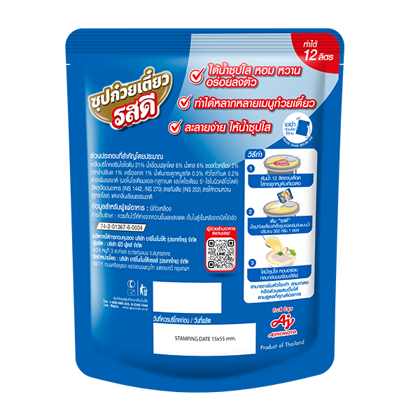 RosDee® Noodle soup Liquid Naam Sai lodized Salt 21% Fructose Syrup 6% Sugar 6% Soy Sauce 2% Cabbage Paste 1% Spices 1% Pork Stock 0.3% Radish Paste 0.2% Flavor Enhancer (Monosodium L-glutamate and Disodium 5'-ribonucleotides) Food Additives (INS 1442, INS 270) Preservative (INS 202) Sweetener (Sucralose) Nature Identical Flavor Added Contains Soybean | ![]() |