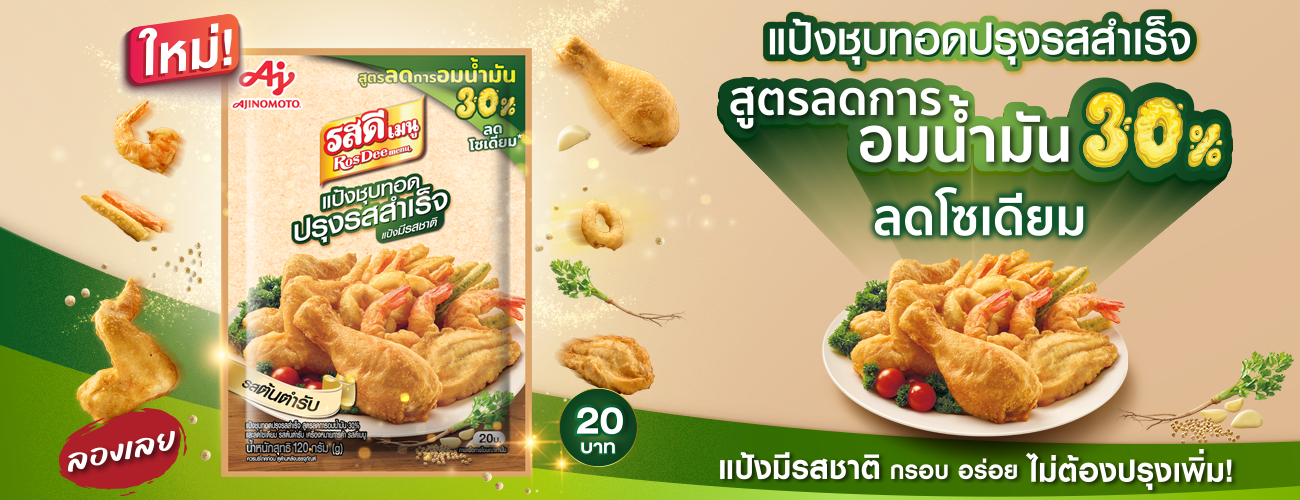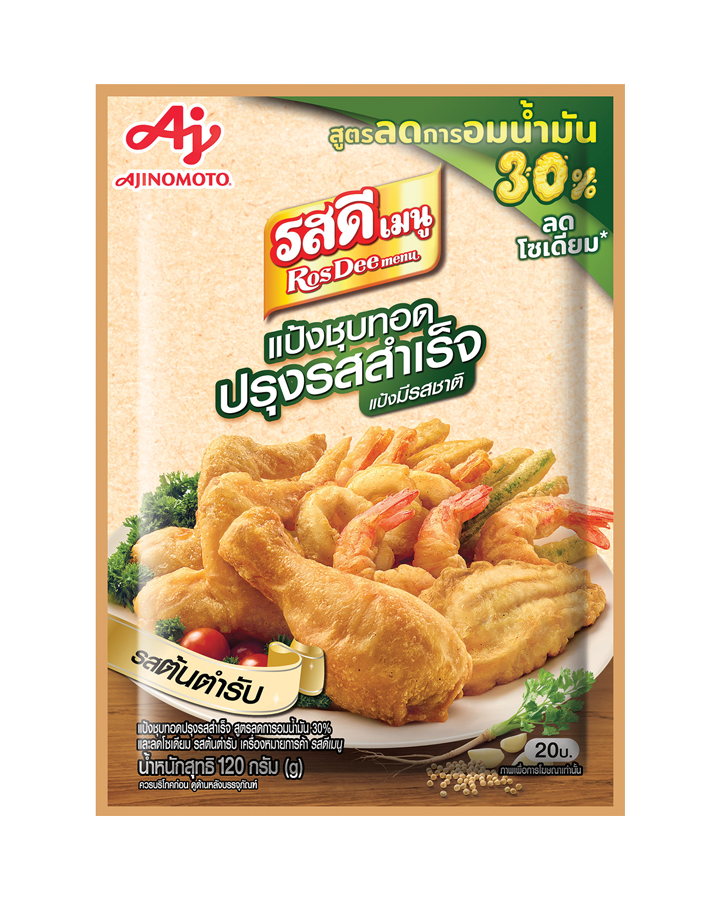Full-Flavor flour reduce oil absorption 30% and less Sodium original flavor with mixture of garlic, pepper and coriander root aroma. Using for dip meat or vegetable. No need to marinated or seasoning. Just dip and fried. Can make your deep fried menu crispy, delicious, full flavor taste with less oil and less Sodium.