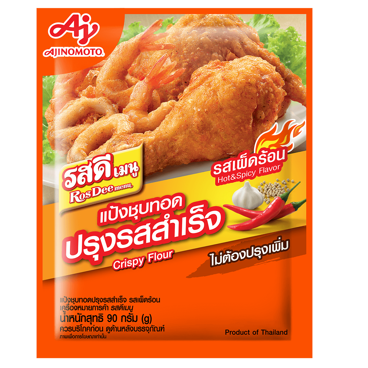 รสดีเมนู แป้งชุบทอดปรุงรสสำเร็จ รสเผ็ดร้อน แป้งสาลี 72% แป้งมันสำปะหลัง 15% เกลือบริโภคเสริมไอโอดีน 3% เครื่องเทศ 2% พริกแห้งผง 1% สารเพิ่มรสชาติ (มอโนโซเดียมแอล-กลูทาเมต และไดโซเดียม 5'-ไรโบนิวคลิโอไตด์) สารช่วยให้ฟู (INS 450(i), INS 500(ii), INS 341(i)) สารทำให้คงตัว (INS 412) แต่งกลิ่นธรรมชาติ ข้อมูลสำหรับผู้แพ้อาหาร: มีข้าวสาลี