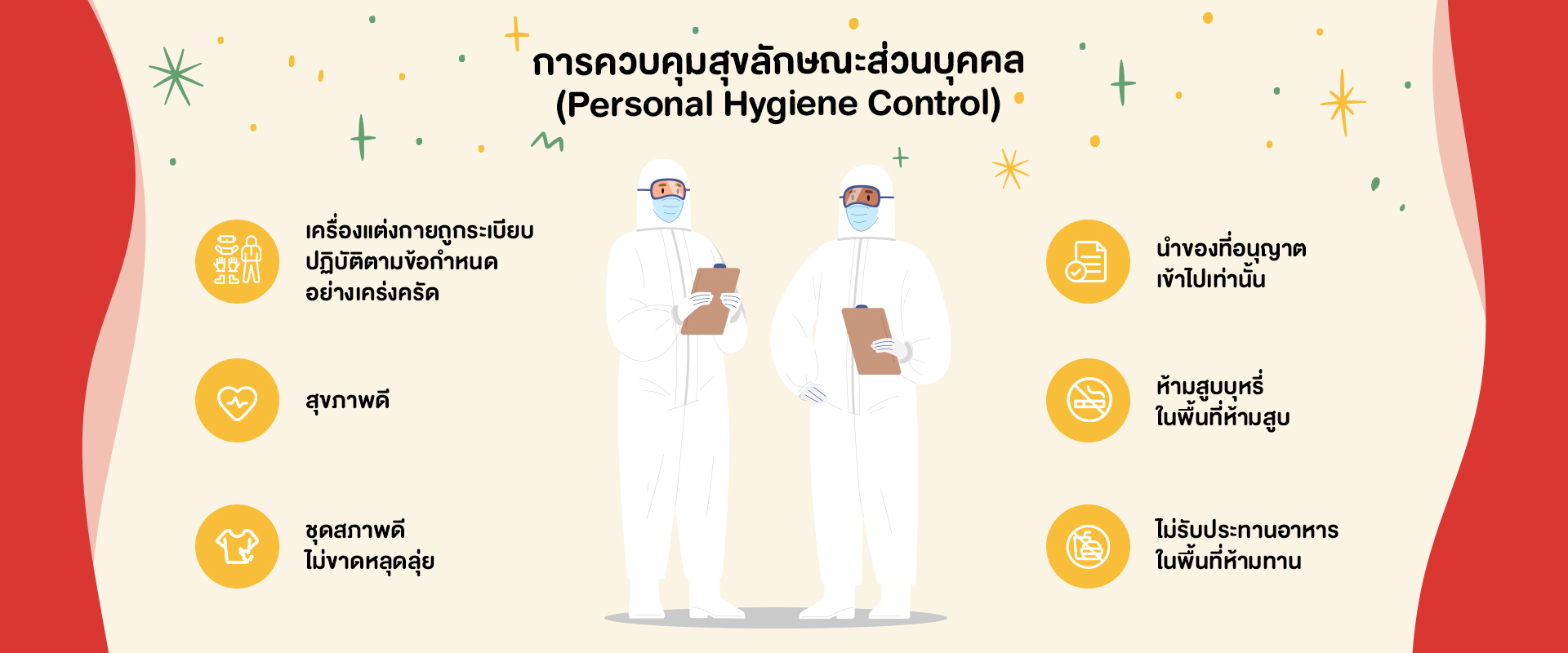 การปนเปื้อนที่เกิดขึ้นได้ง่ายที่สุดนั้นมาจากผู้คนที่อยู่ในพื้นที่การผลิตทั้งหมด ไม่ว่าจะเป็น เส้นผม เครื่องประดับ สิ่งของ ชิ้นส่วนใดๆ ก็ตามที่ติดอยู่กับตัวก็มีโอกาสที่จะหลุดร่วงปนเปื้อนไปในผลิตภัณฑ์ได้ทั้งสิ้น ทำให้โรงงานต้องมี ‘ข้อกำหนดเรื่องสุขลักษณะส่วนบุคคล’ ที่พนักงานต้องปฏิบัติตามอย่างเคร่งครัด ดังนี้