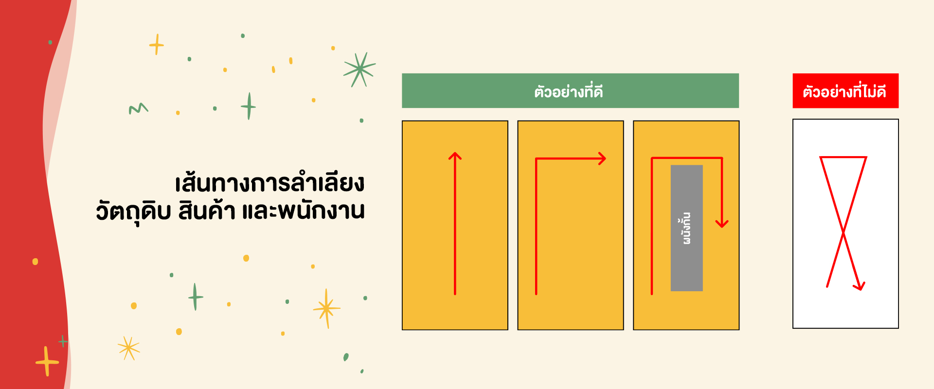 - หลีกเลี่ยงการใช้เส้นทางลำเลียงวัตถุดิบ สินค้า และ ของเสียร่วมกัน เช่น แยกเส้นทางการลำเลียงของสินค้า