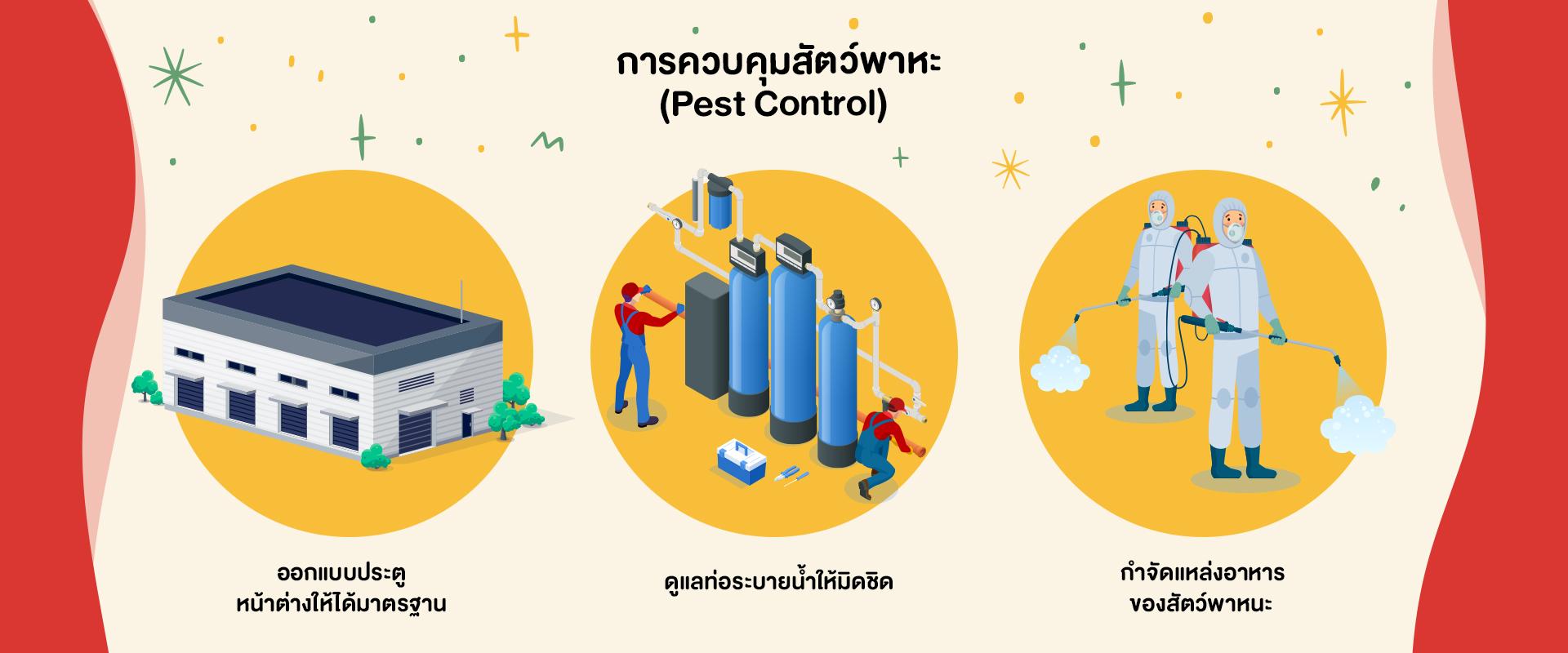 สัตว์ตัวเล็ก ตัวน้อย เช่น แมลง มด หนู ฯลฯ ที่ตามกลิ่นอาหารมา นับเป็นพาหะของเชื้อโรคที่ทำให้เกิดการปนเปื้อนได้ โรงงานจึงควรมีระบบควบคุมสัตว์พาหะ โดยพิจารณาว่าแต่ละพื้นที่ผลิตมีความเสี่ยงต่อสัตว์ประเภทไหน จากนั้นจึงกำหนดวิธีการกำจัดให้เหมาะสม ได้แก่