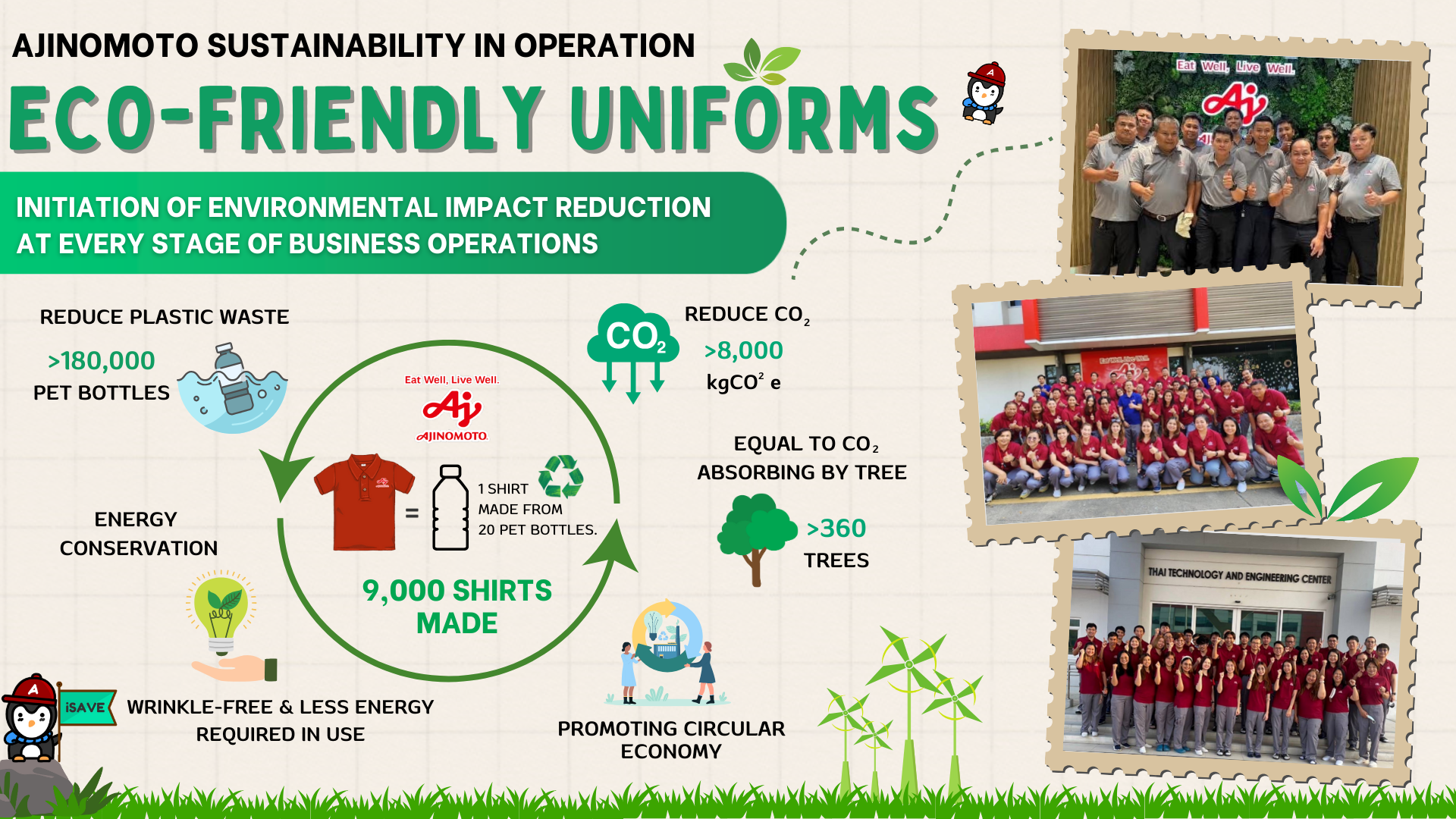 เมื่อเราพูดถึงเสื้อเพียงตัวเดียวอาจดูเป็นเรื่องเล็กน้อย แต่อายิโนะโมะโต๊ะของเราได้ดำเนินการจัดทำเสื้อยูนิฟอร์มใหม่ จำนวนทั้งสิ้น 9,000 ตัว โดยเสื้อยูนิฟอร์ม 1 ตัว ทำมาจากขยะขวดน้ำพลาสติก (PET Bottle) เฉลี่ย 20 ขวด เลยทีเดียวนั่นเท่ากับว่า เรามีส่วนช่วยในการลดปริมาณขยะพลาสติกที่จะถูกทิ้งไปสู่ทะเลหรือฝังกลบ ได้มากกว่า 180,000 ขวด
